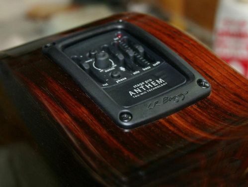 We proudly feature the Stagepro Anthem dual pickup preamp/E.Q. system, which combines the L.R. Baggs Tru•Mic technology pickup, and the Element™ undersaddle piezo pickup. The side-mounted preamp/EQ includes a mix/blender control and features volume, treble, bass, and phase inversion controls-including an onboard built-in tuner.